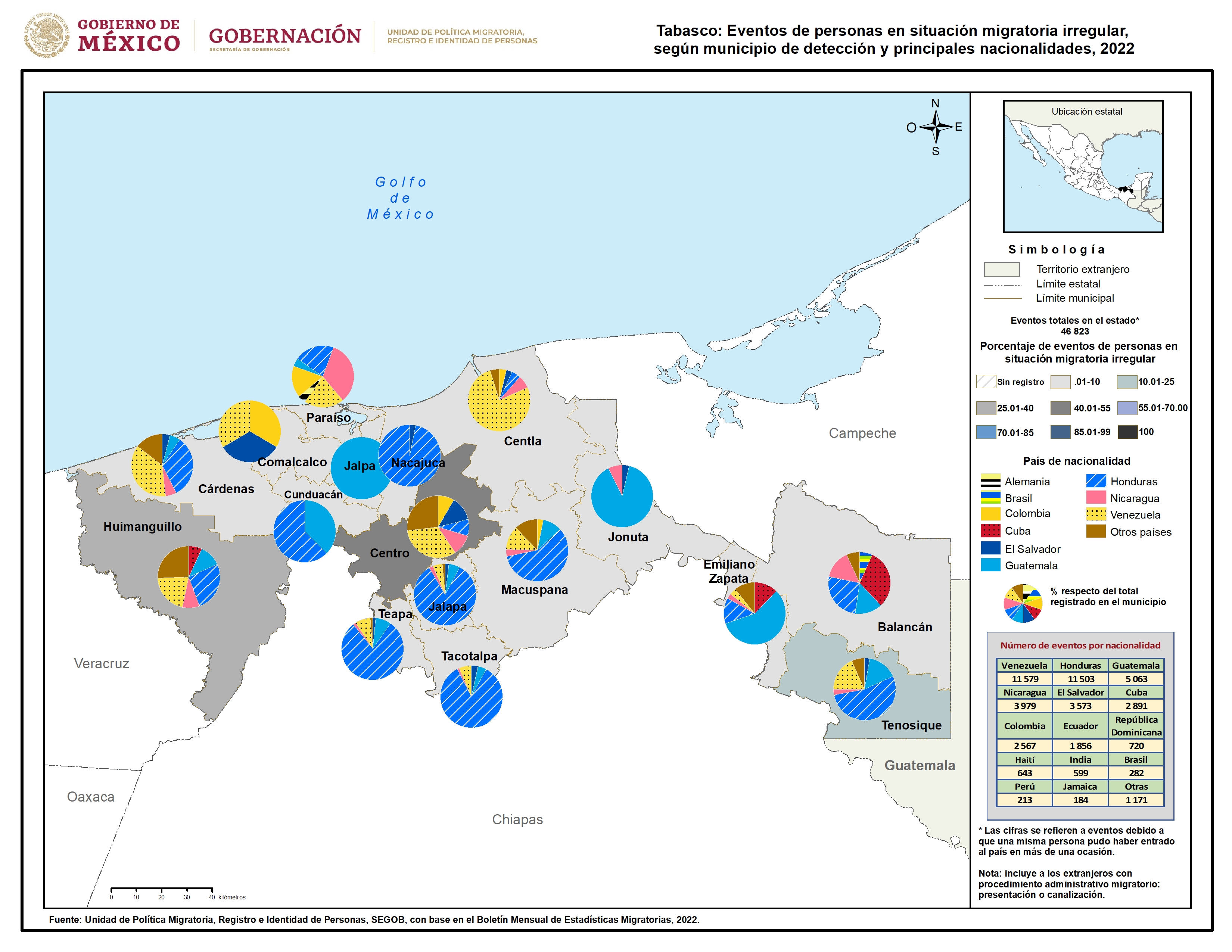 - Tabasco: Eventos de personas en situación migratoria irregular, según municipio de detección y principales nacionalidades, 2022