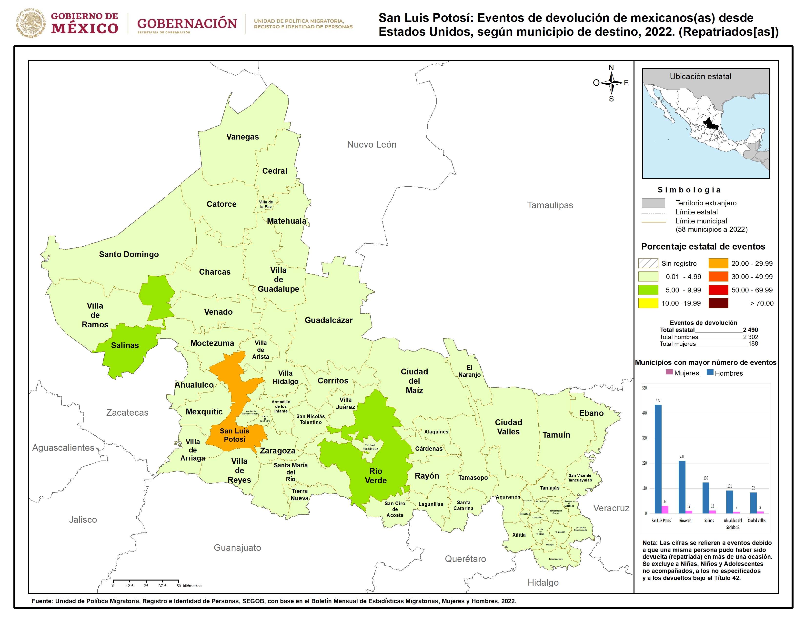 - San Luis Potosí: Eventos de devolución de mexicanos(as) desde Estados Unidos, según municipio de destino, 2022. (Repatriados[as])