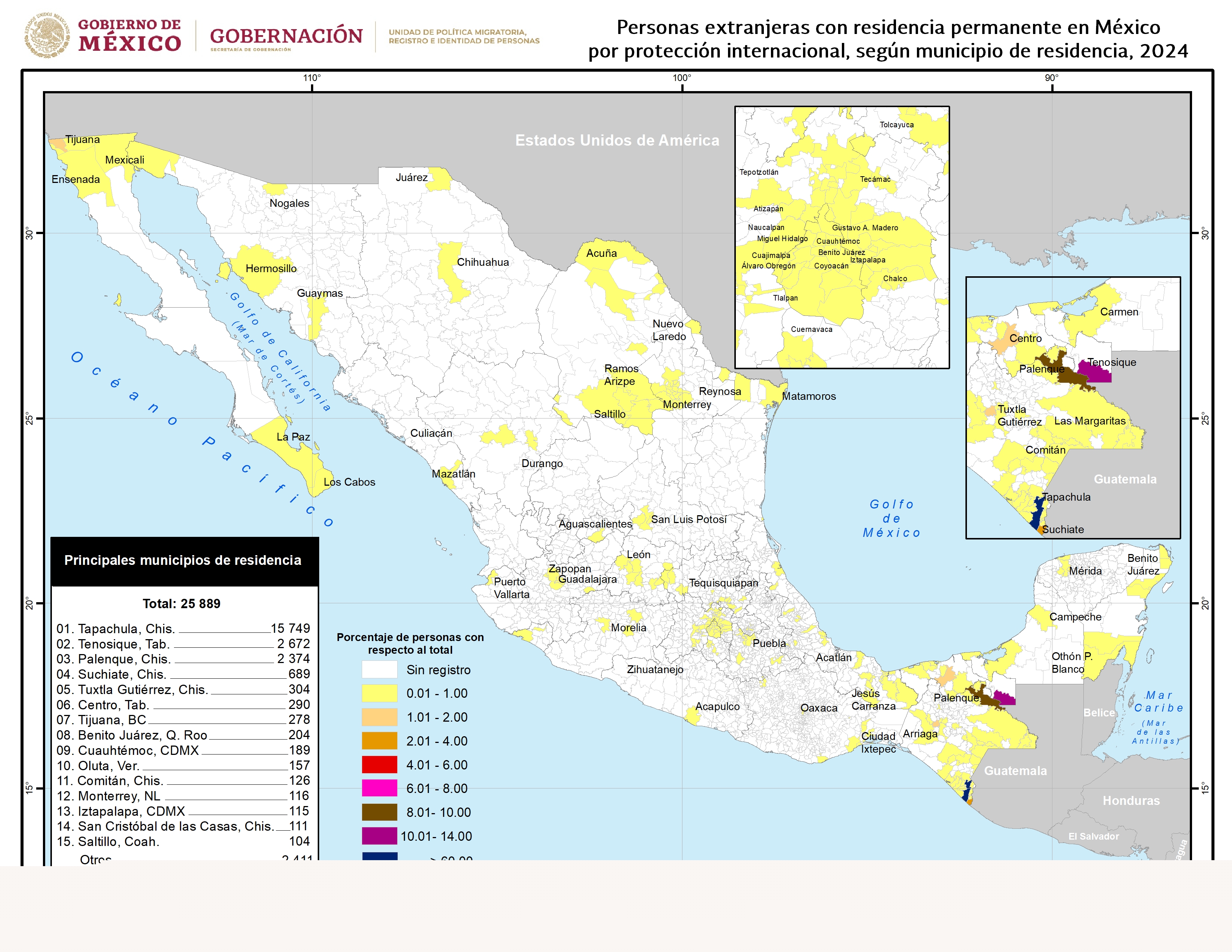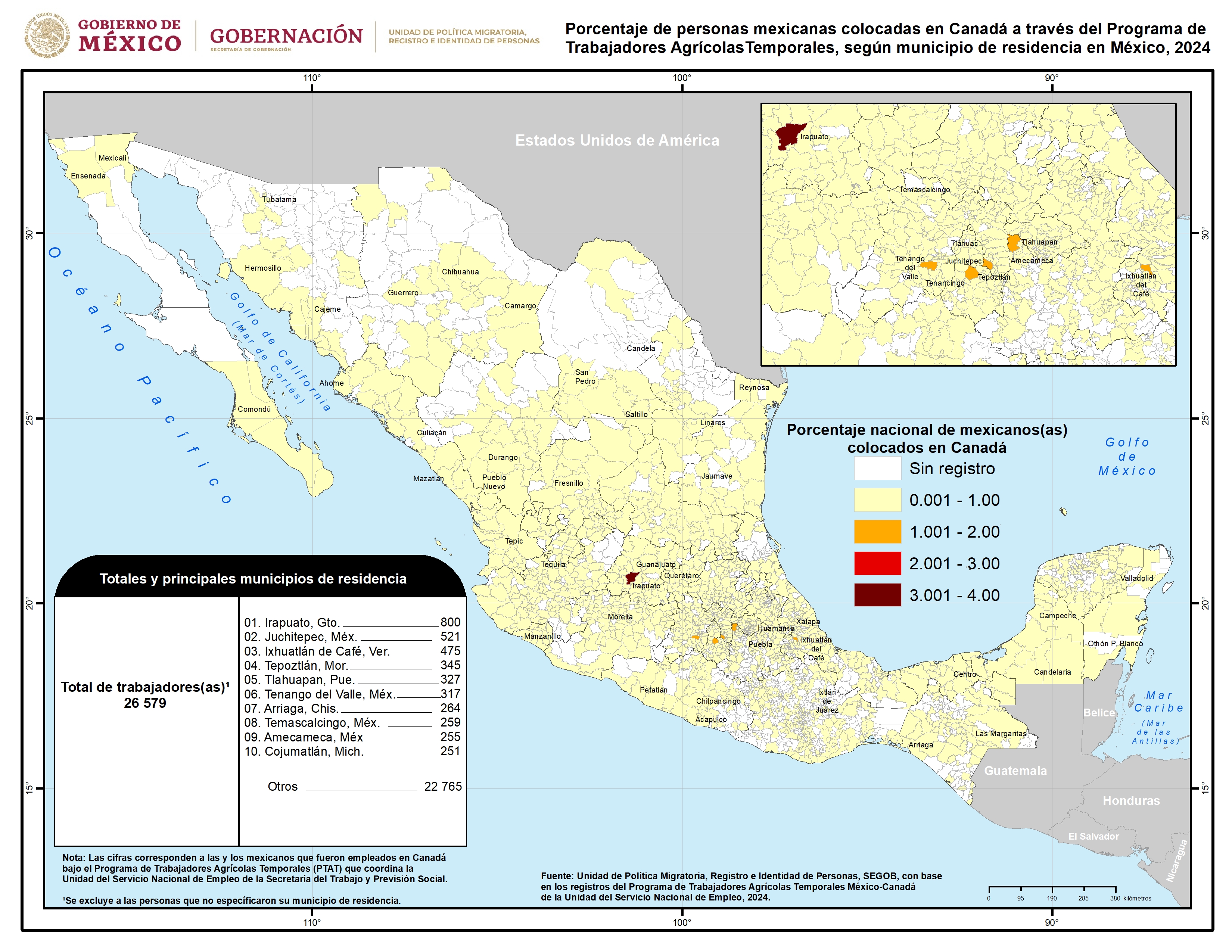 - Porcentaje de personas mexicanas colocadas en Canadá a través del Programa de Trabajadores Agrícolas Temporales, según municipio de residencia en México, 2024