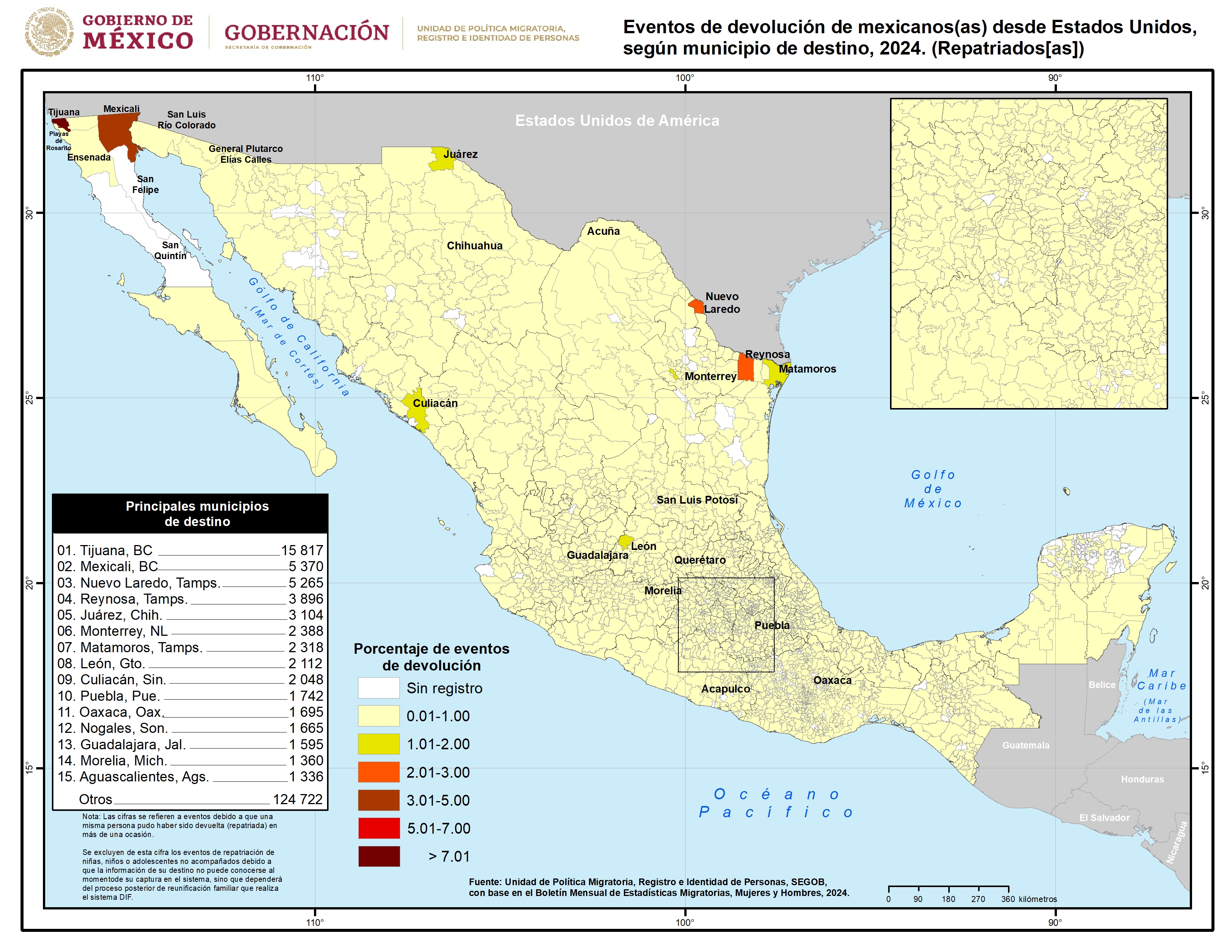 - México: Eventos de devolución de mexicanos(as) desde Estados Unidos, según municipio de destino, 2024. (Repatriados[as])