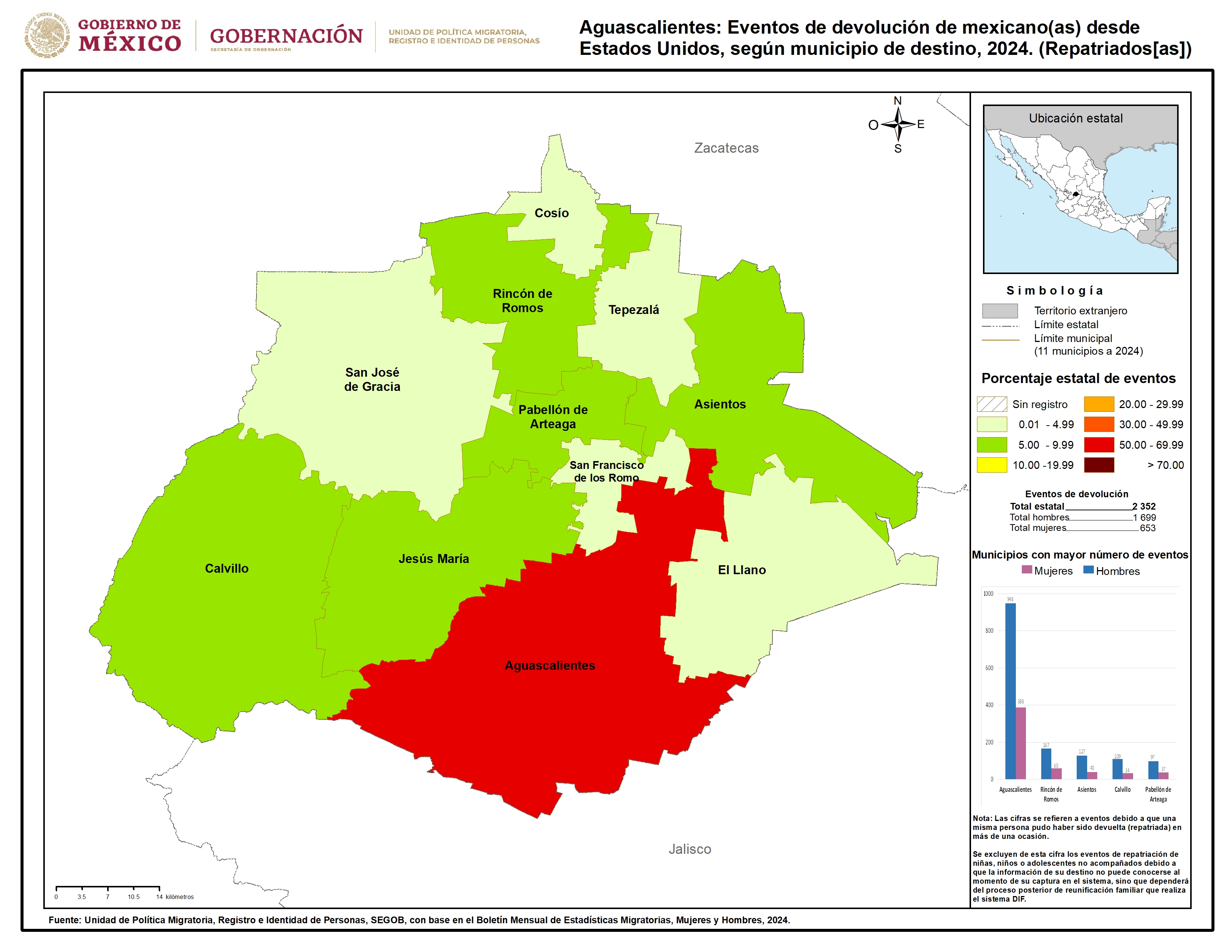 - Aguascalientes: Eventos de devolución de mexicanos(as) desde Estados Unidos, según municipio de destino, 2024 (Repatriados[as])