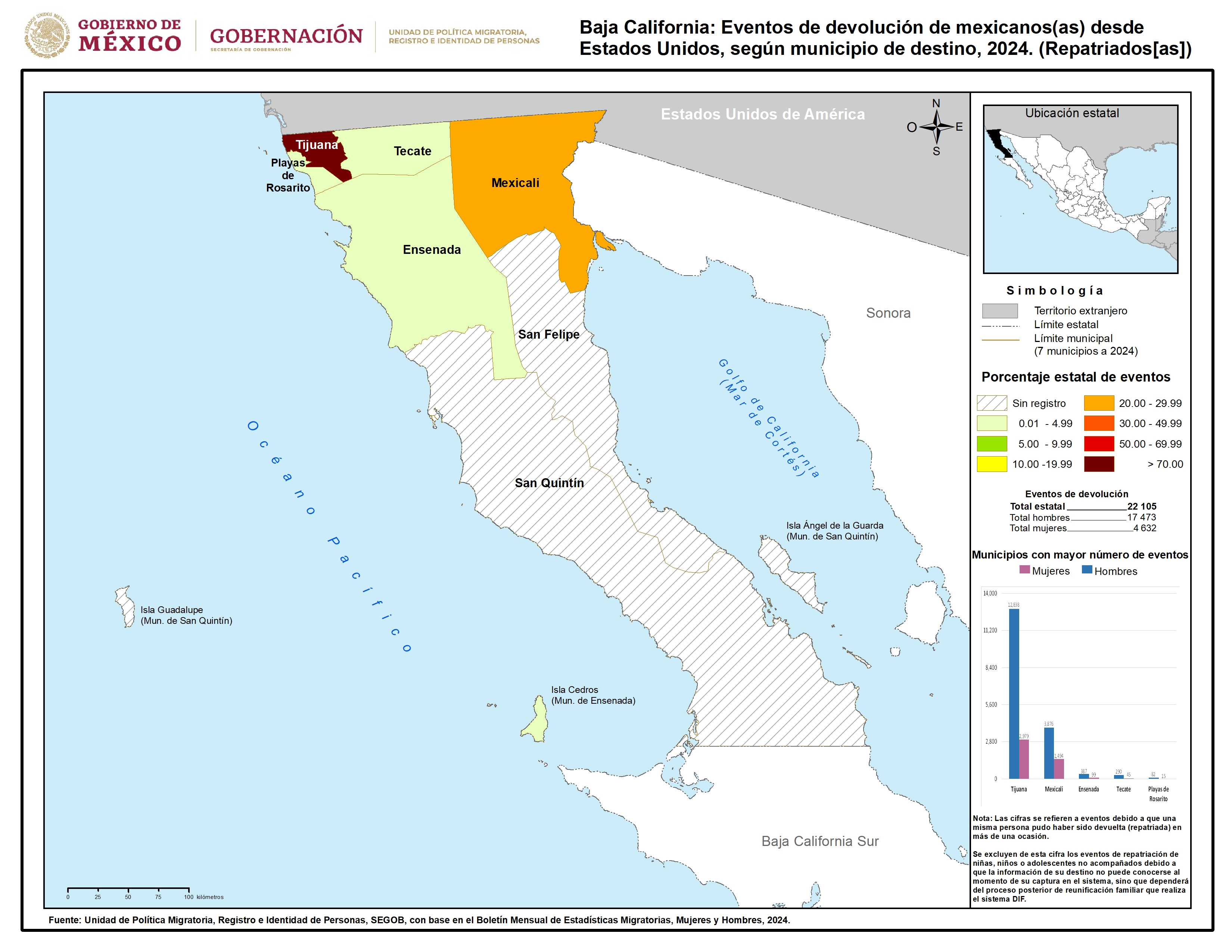 - Baja California: Eventos de devolución de mexicanos(as) desde Estados Unidos, según municipio de destino, 2024. (Repatriados[as])