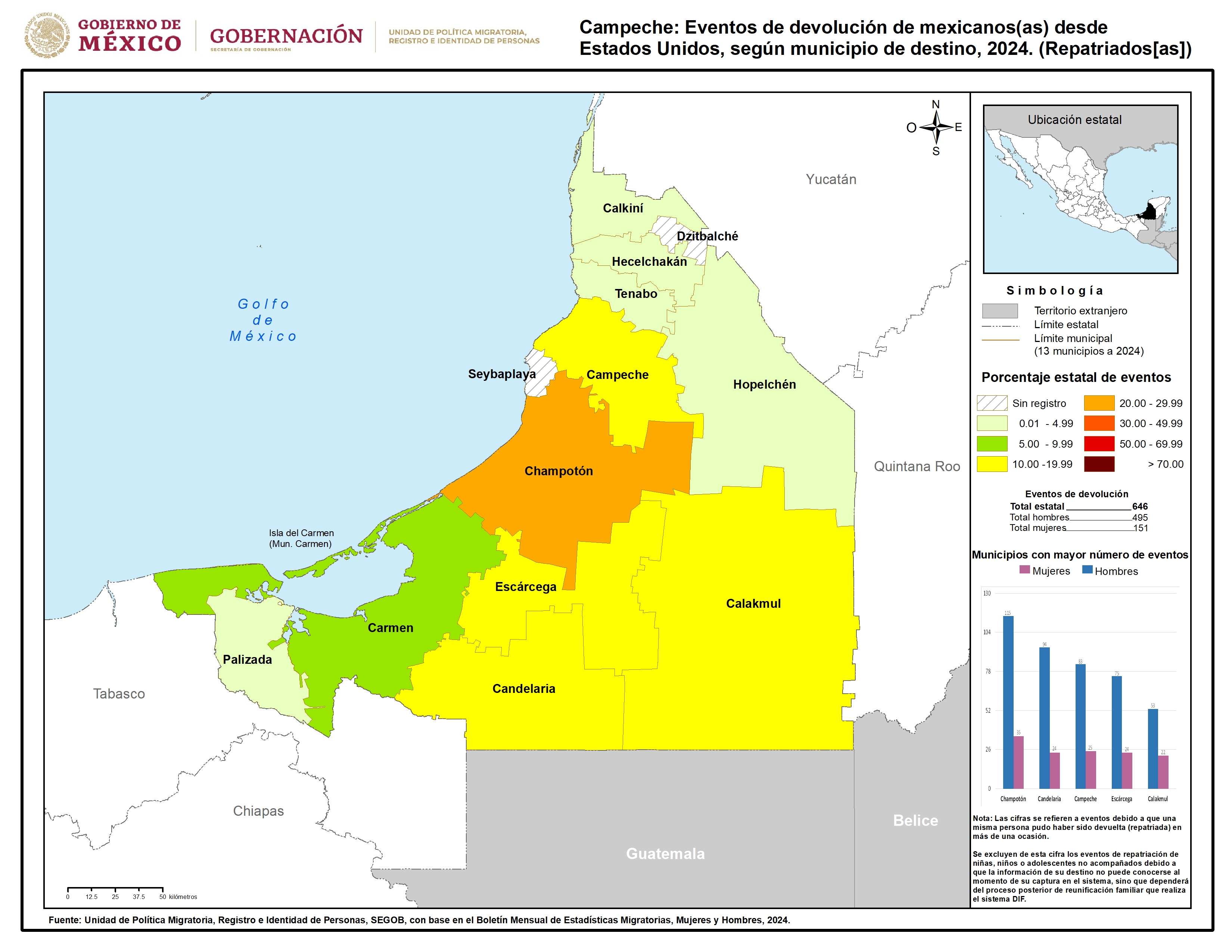 - Campeche: Eventos de devolución de mexicanos(as) desde Estados Unidos, según municipio de destino, 2024. (Repatriados[as])