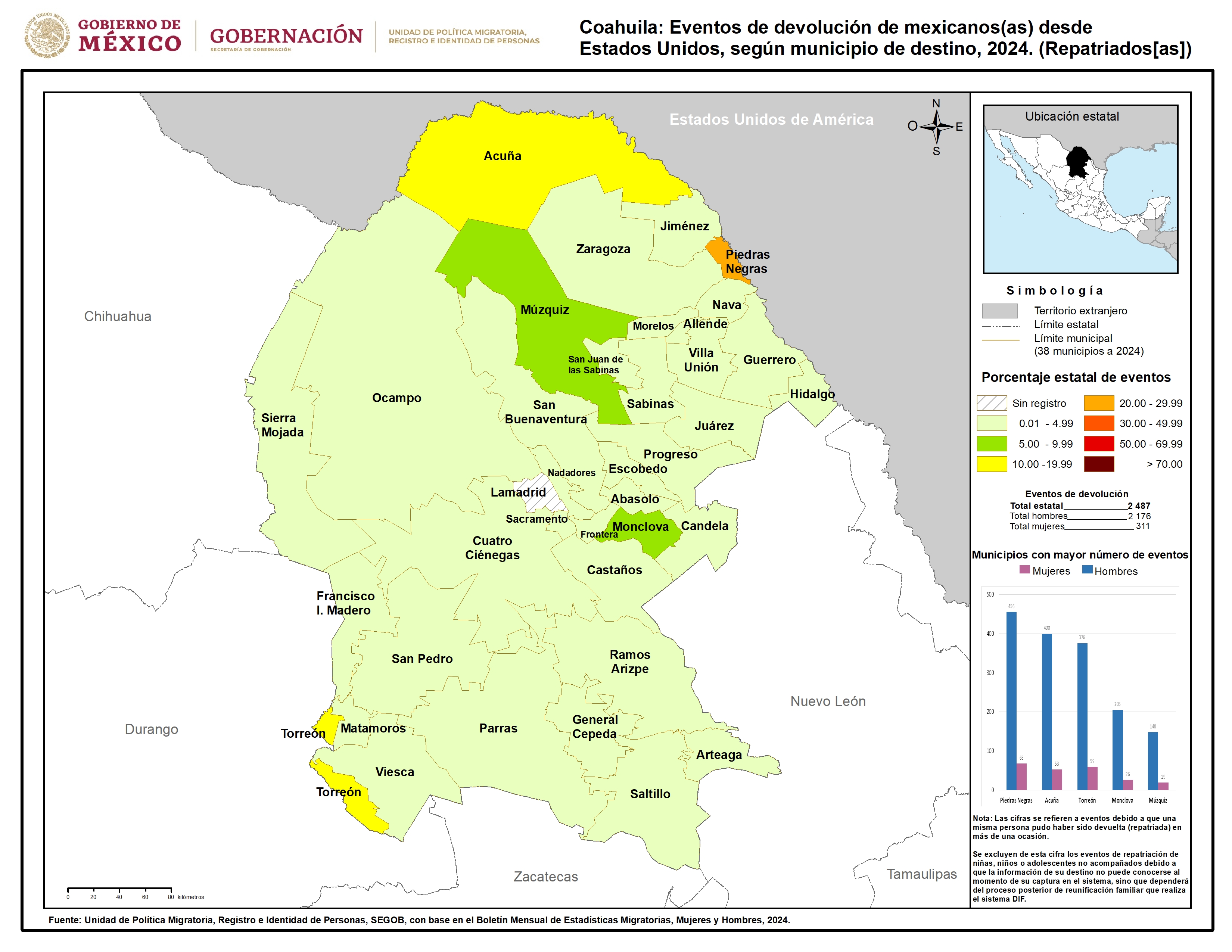 - Coahuila: Eventos de devolución de mexicanos(as) desde Estados Unidos, según municipio de destino, 2024. (Repatriados[as])