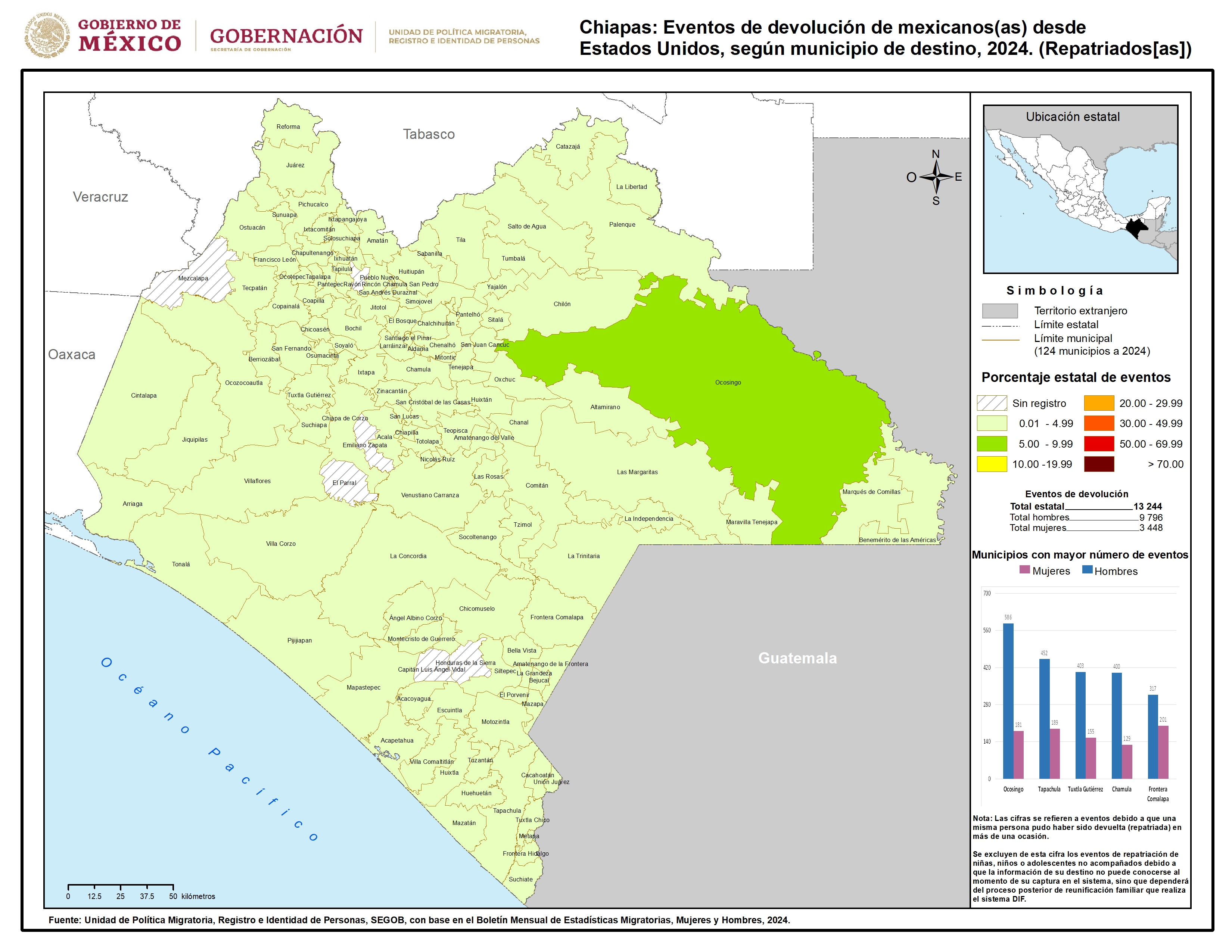 - Chiapas: Eventos de devolución de mexicanos(as) desde Estados Unidos, según municipio de destino, 2024. (Repatriados[as])