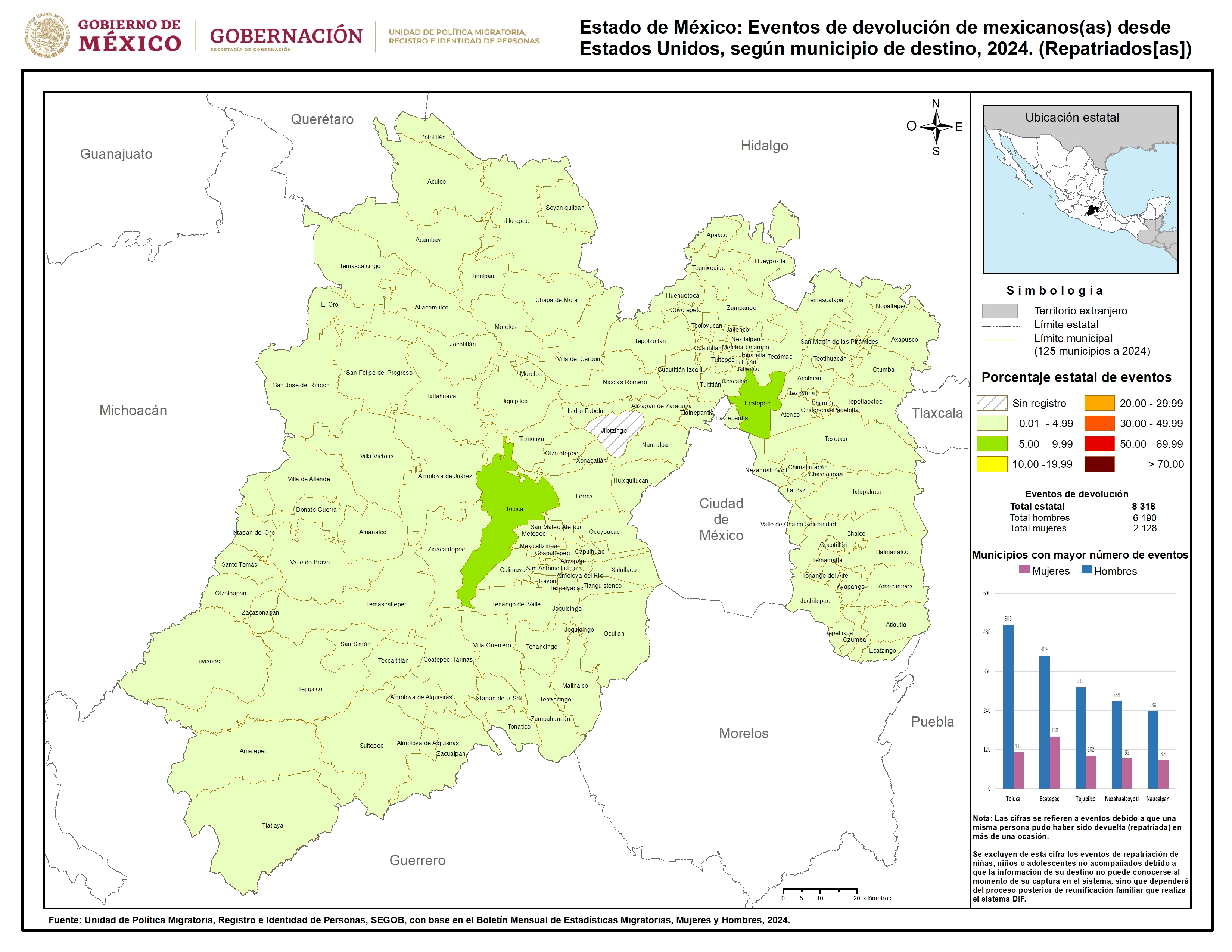 - Eventos de devolución de mexicanos(as) desde Estados Unidos, según municipio de destino, 2024. (Repatriados[as])