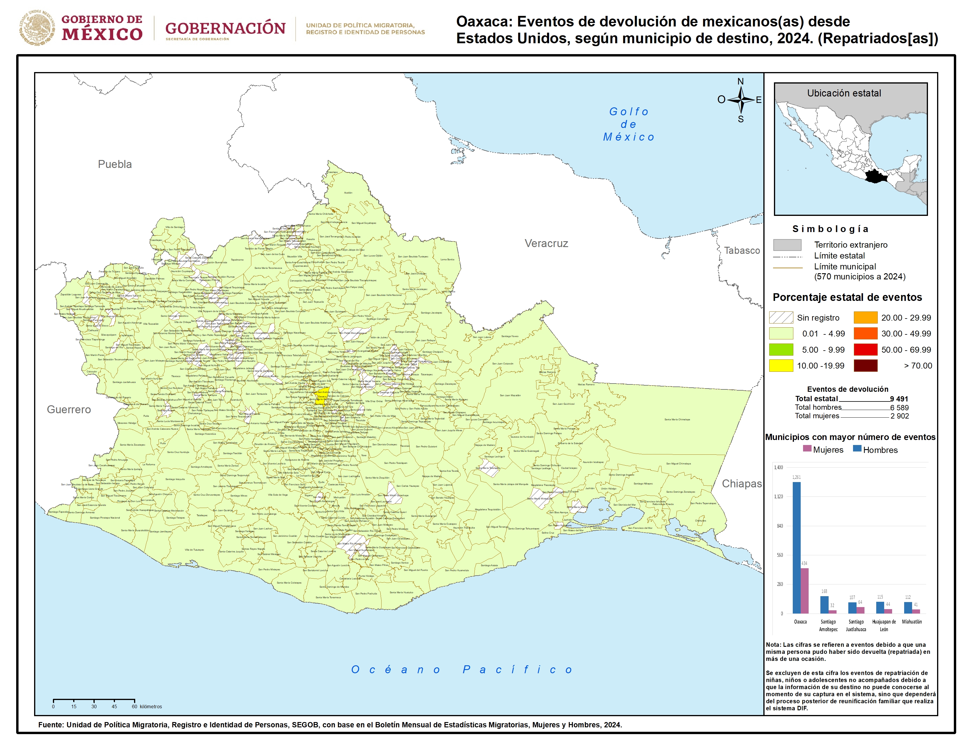 - Oaxaca: Eventos de devolución de mexicanos(as) desde Estados Unidos, según municipio de destino, 2024. (Repatriados[as])
