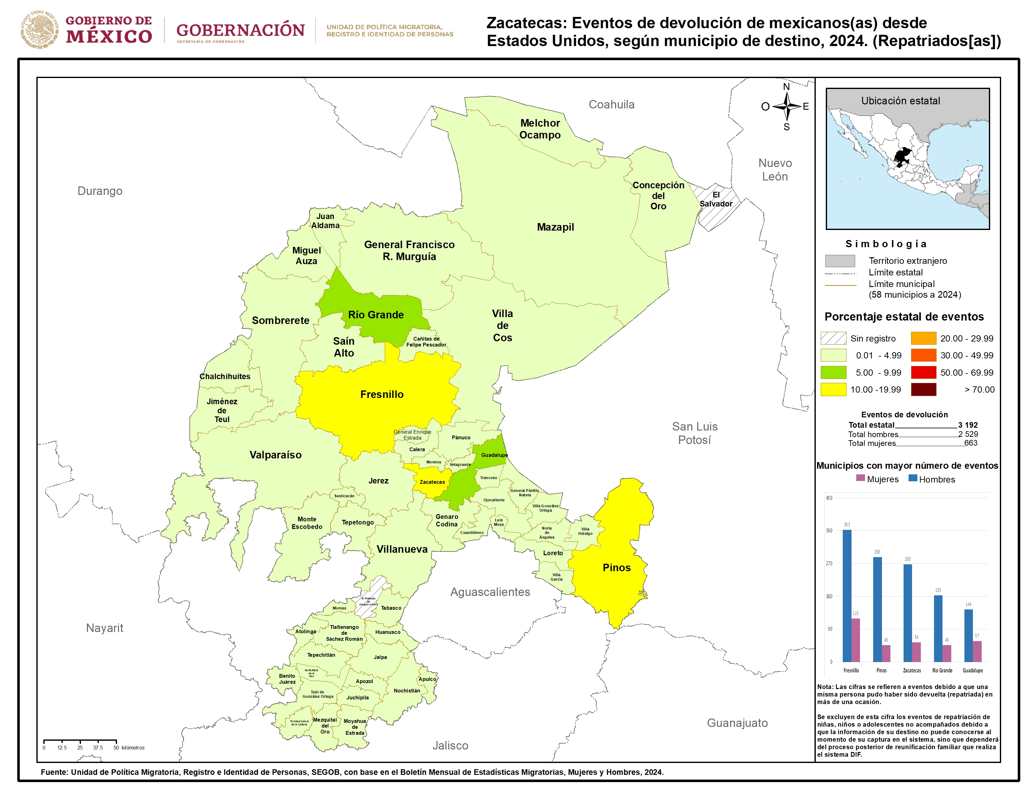 - Zacatecas: Eventos de devolución de mexicanos(as) desde Estados Unidos, según municipio de destino, 2024. (Repatriados[as])