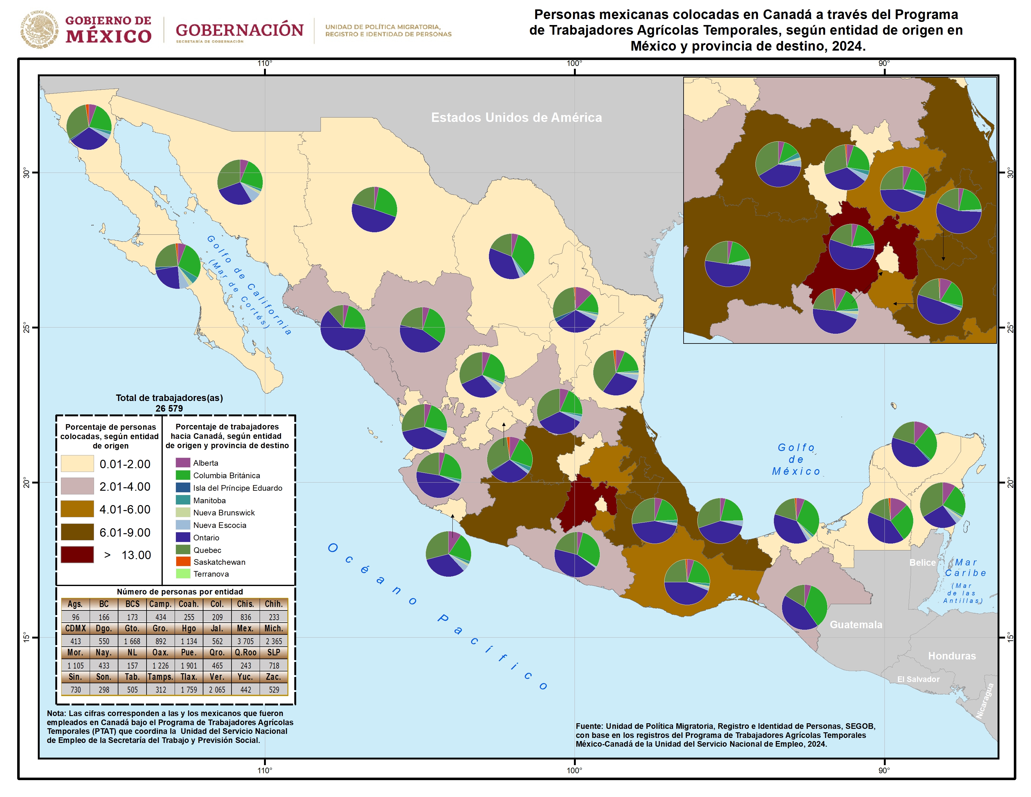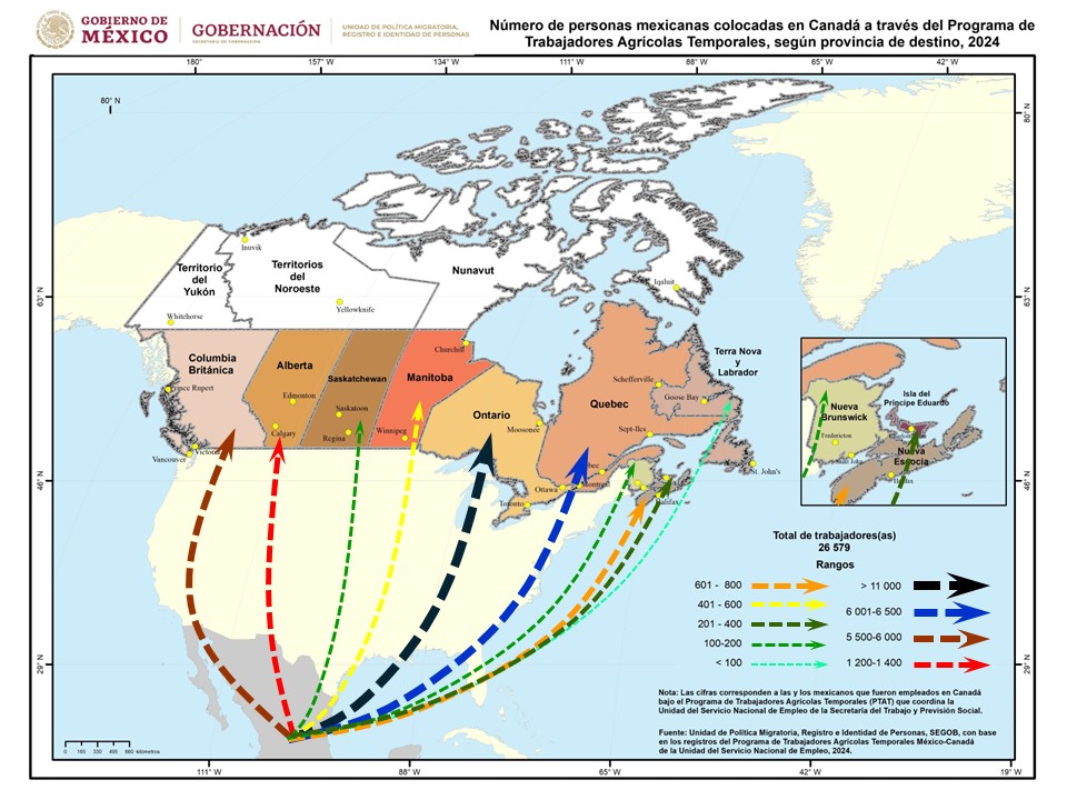 - Número de personas mexicanas colocadas en Canadá a través del Programa de Trabajadores Agrícolas Temporales, según provincia de destino, 2024