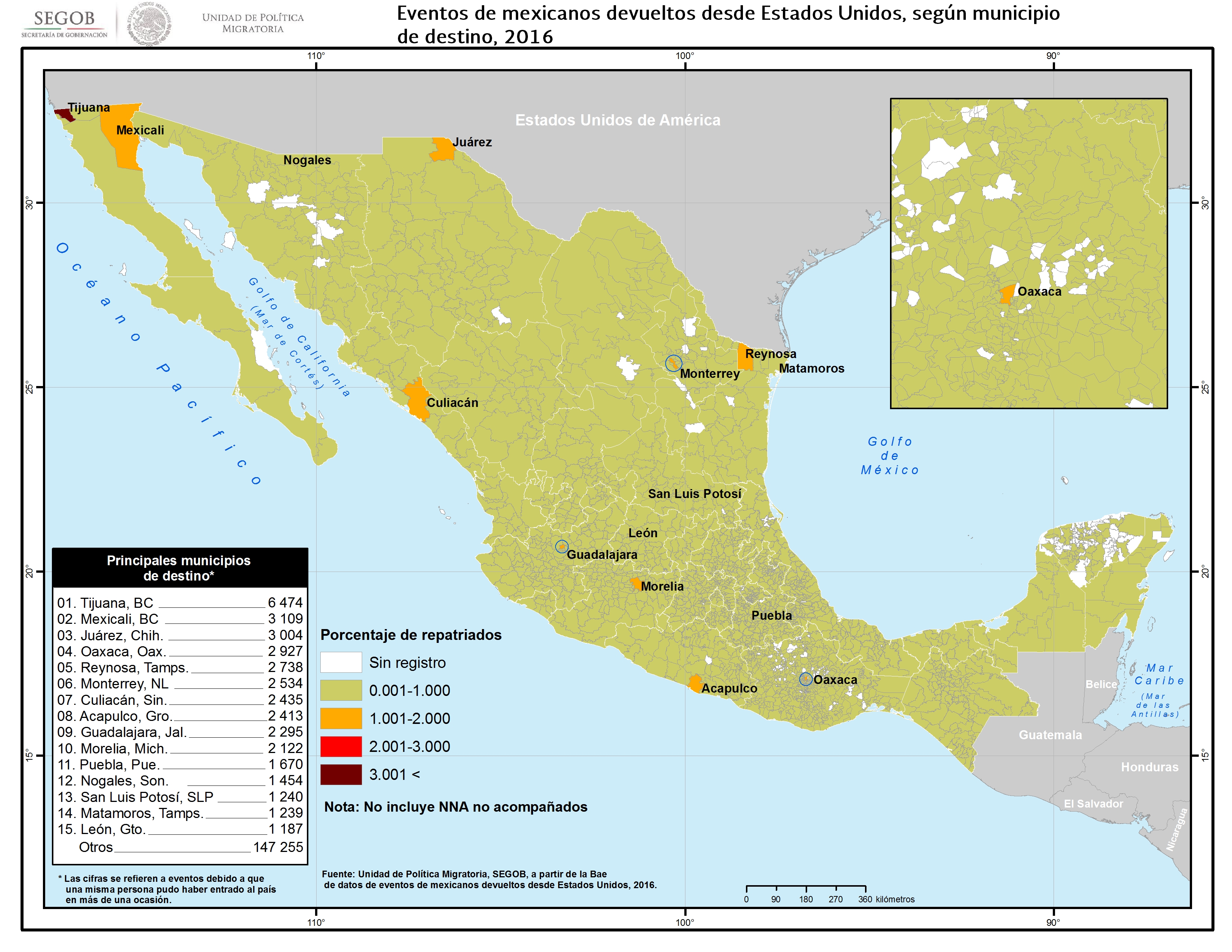 - Eventos de Mexicanos devueltos desde Estados Unidos, según municipio de destino, 2016