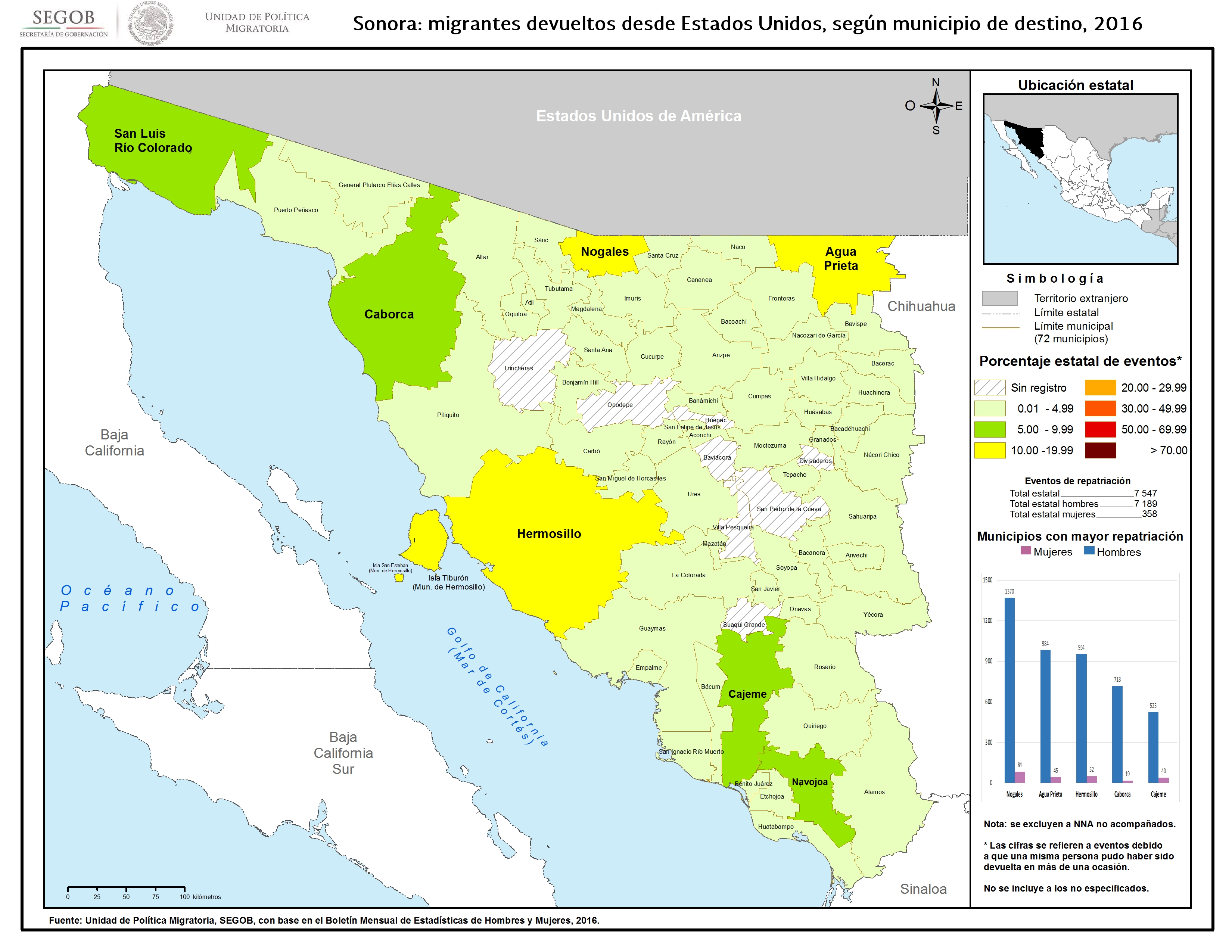 - Sonora: migrantes devueltos desde Estados Unidos, según municipio de destino, 2016