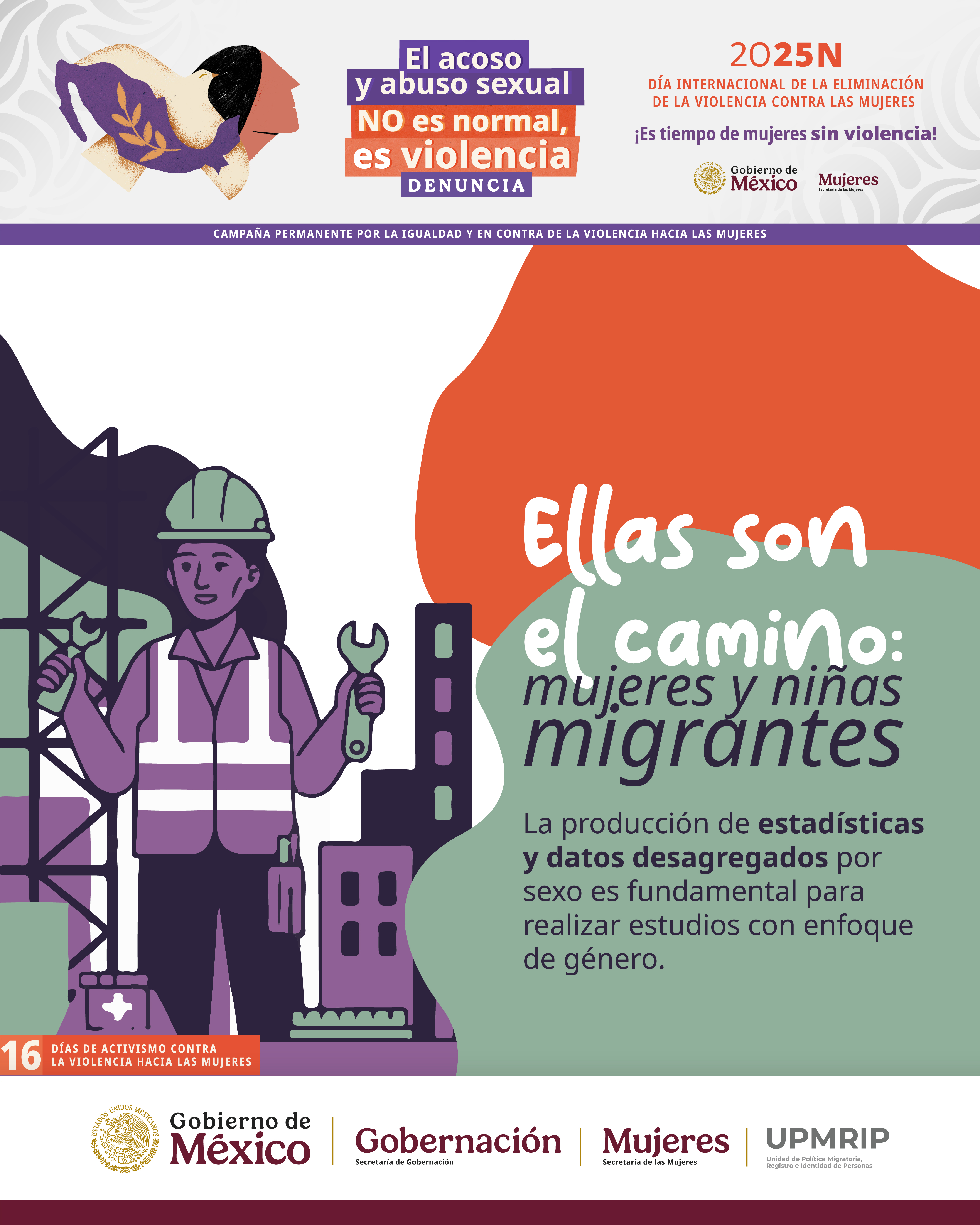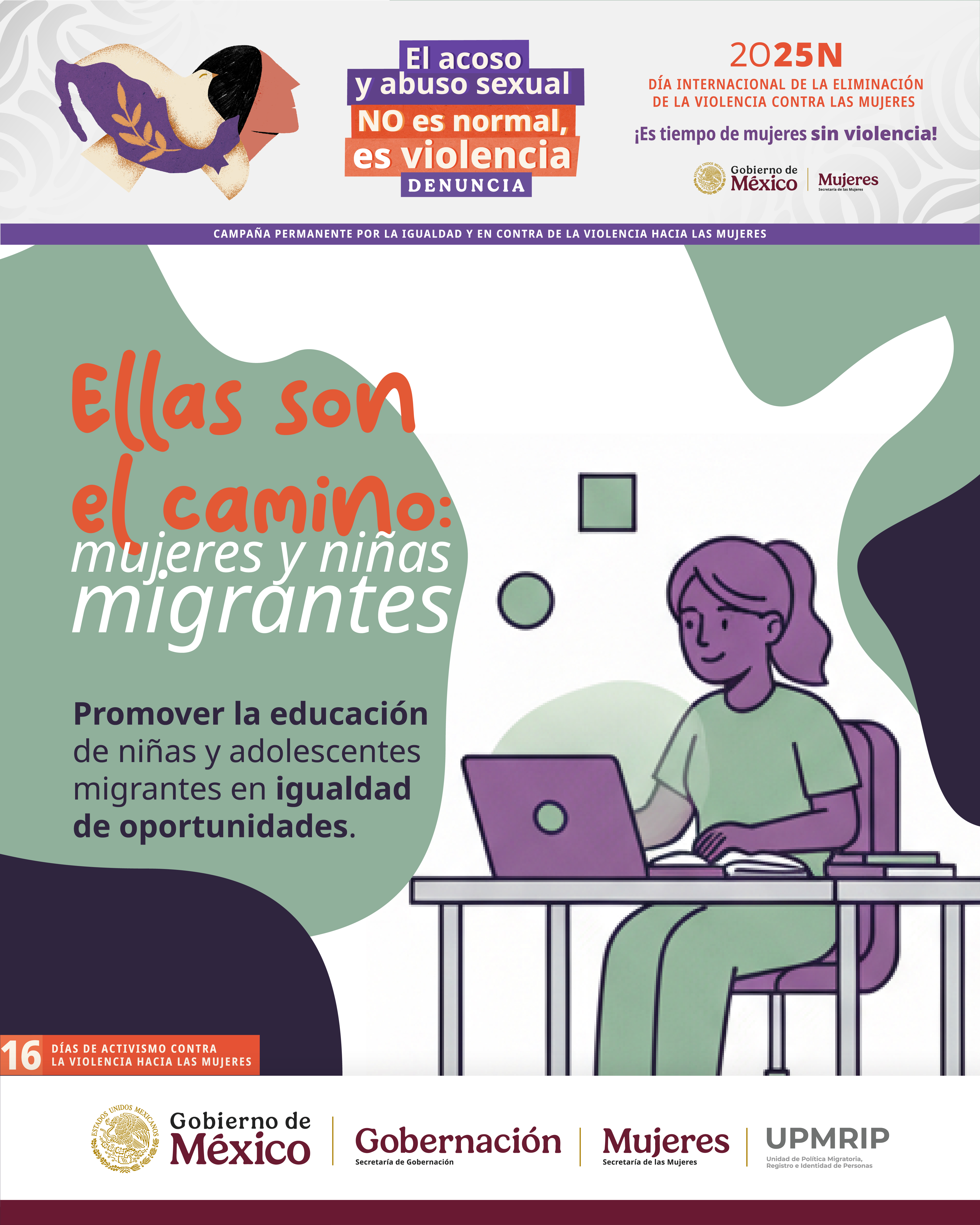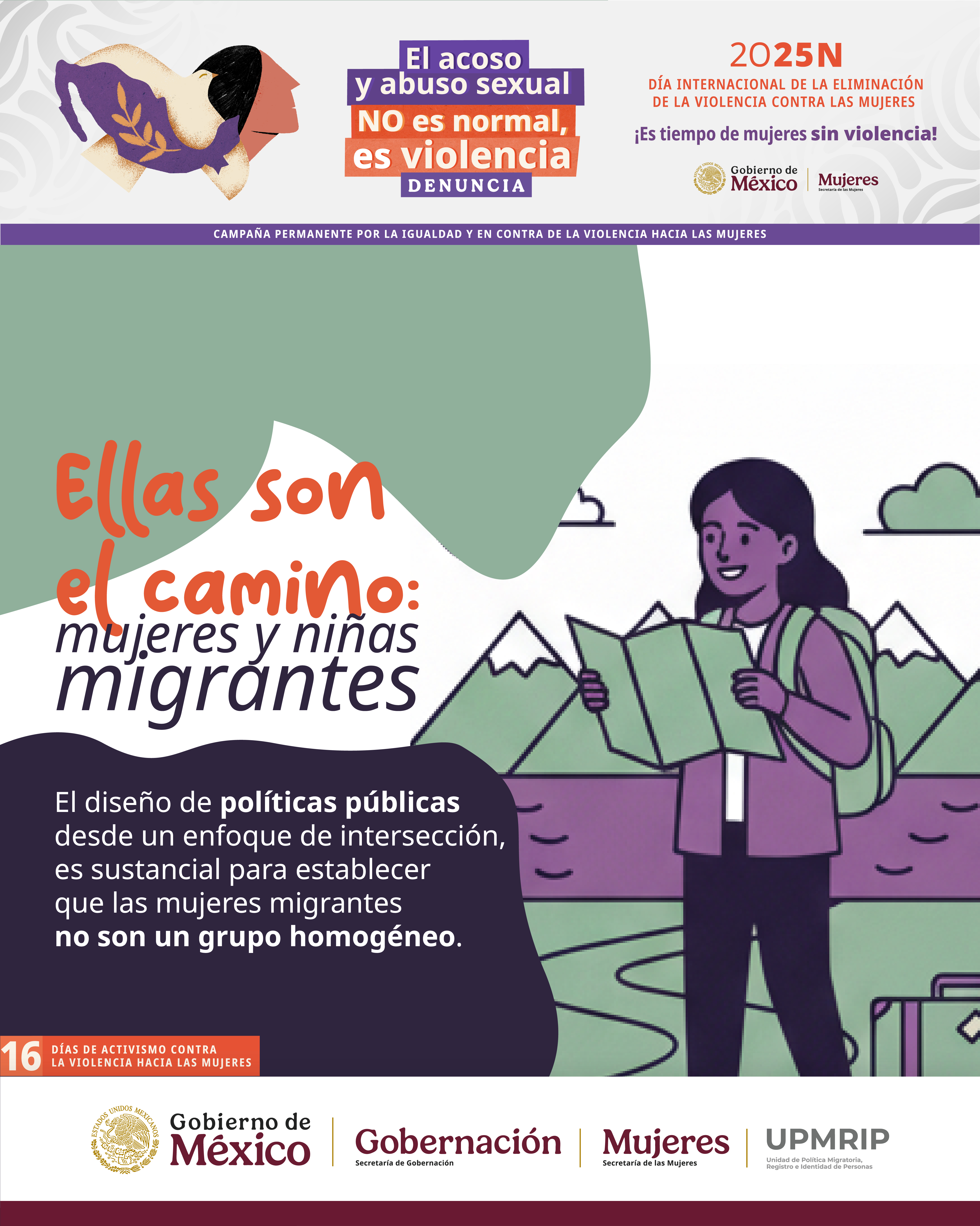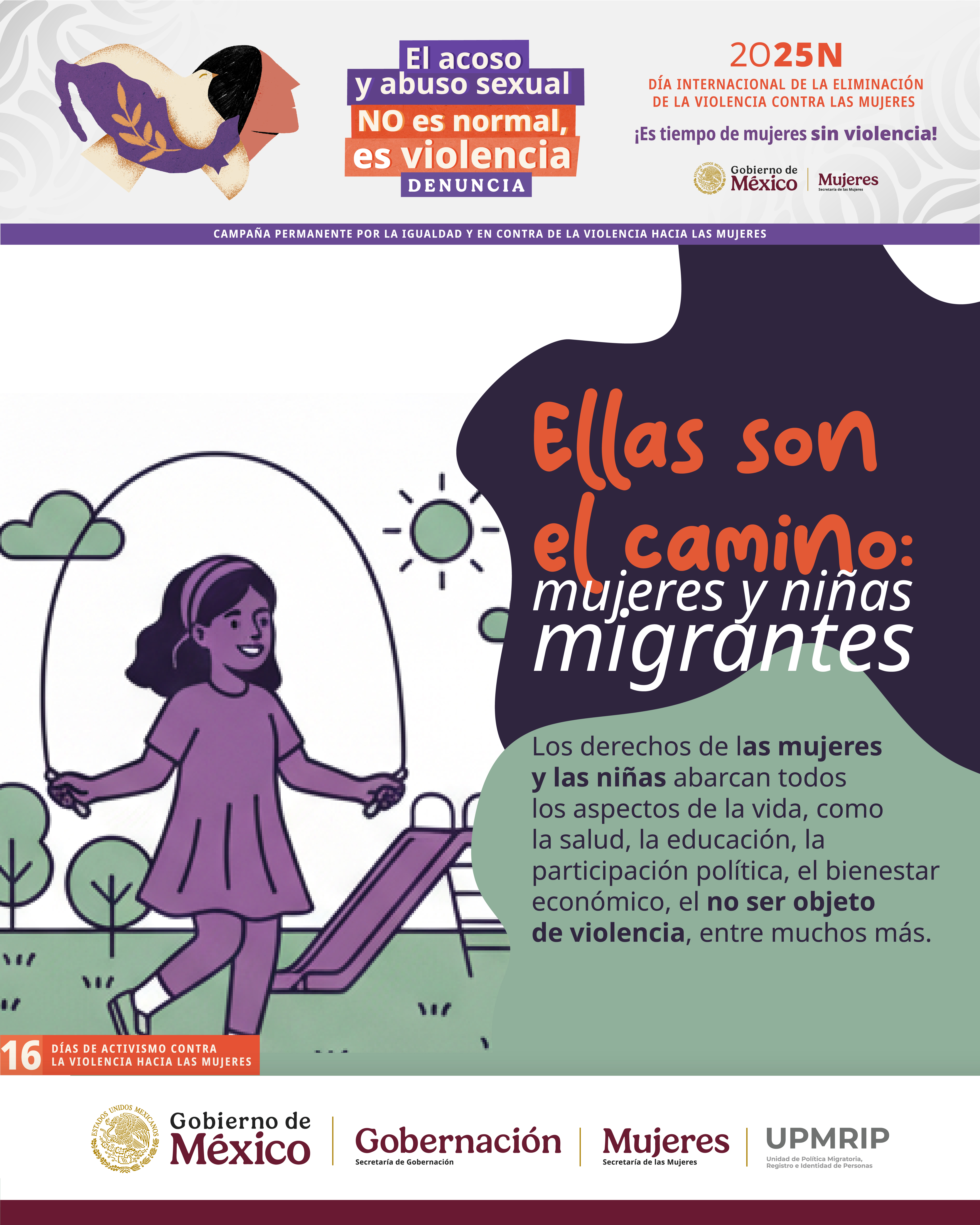 Objetivo: Difundir información que visibilice la participación, aportes y derechos de las niñas, adolescentes y mujeres migrantes, promoviendo el reconocimiento de su papel activo en las comunidades y la importancia de integrar la perspectiva de género en las políticas migratorias, en el marco del Día Internacional de la Eliminación de la Violencia contra la Mujer.