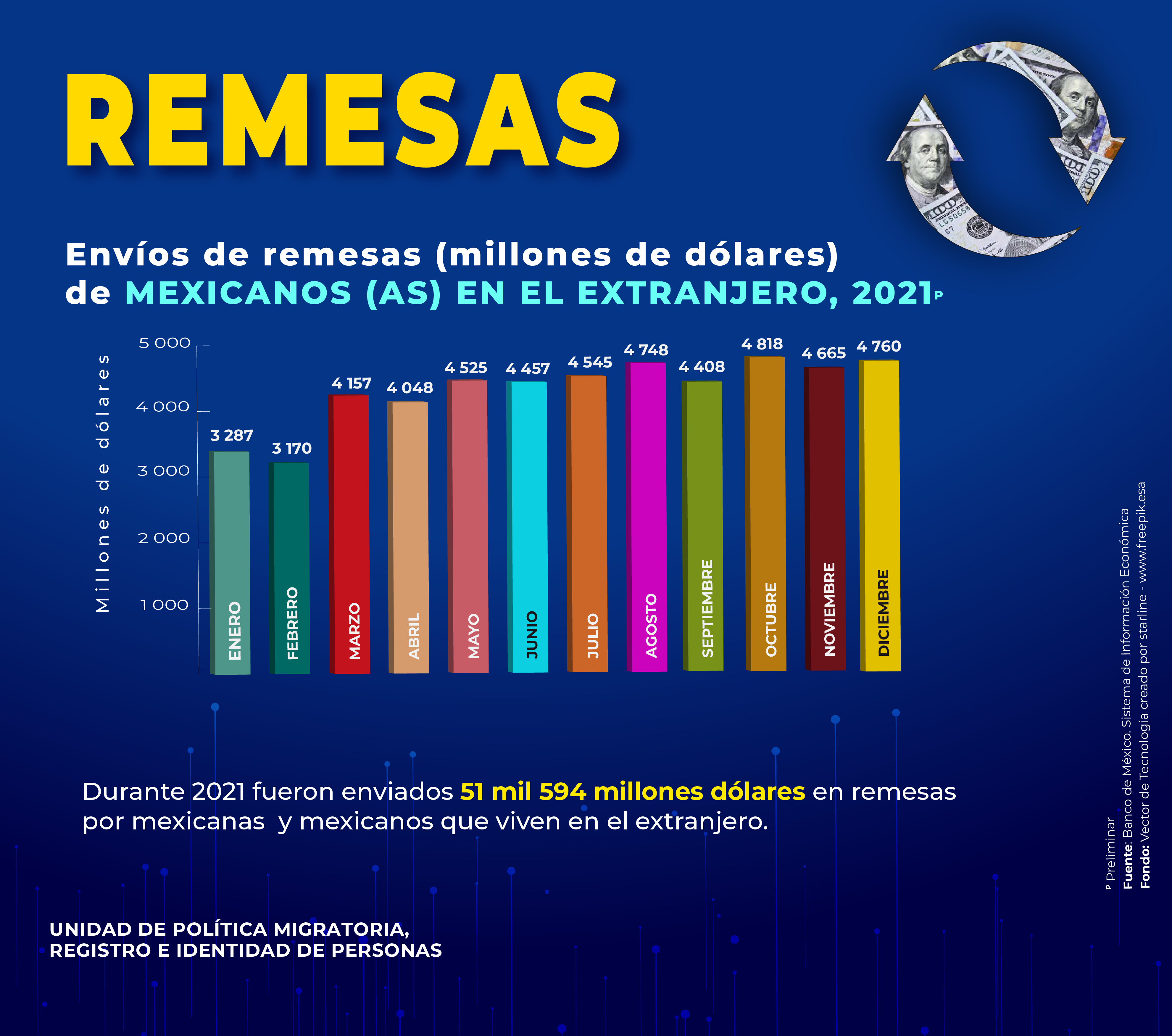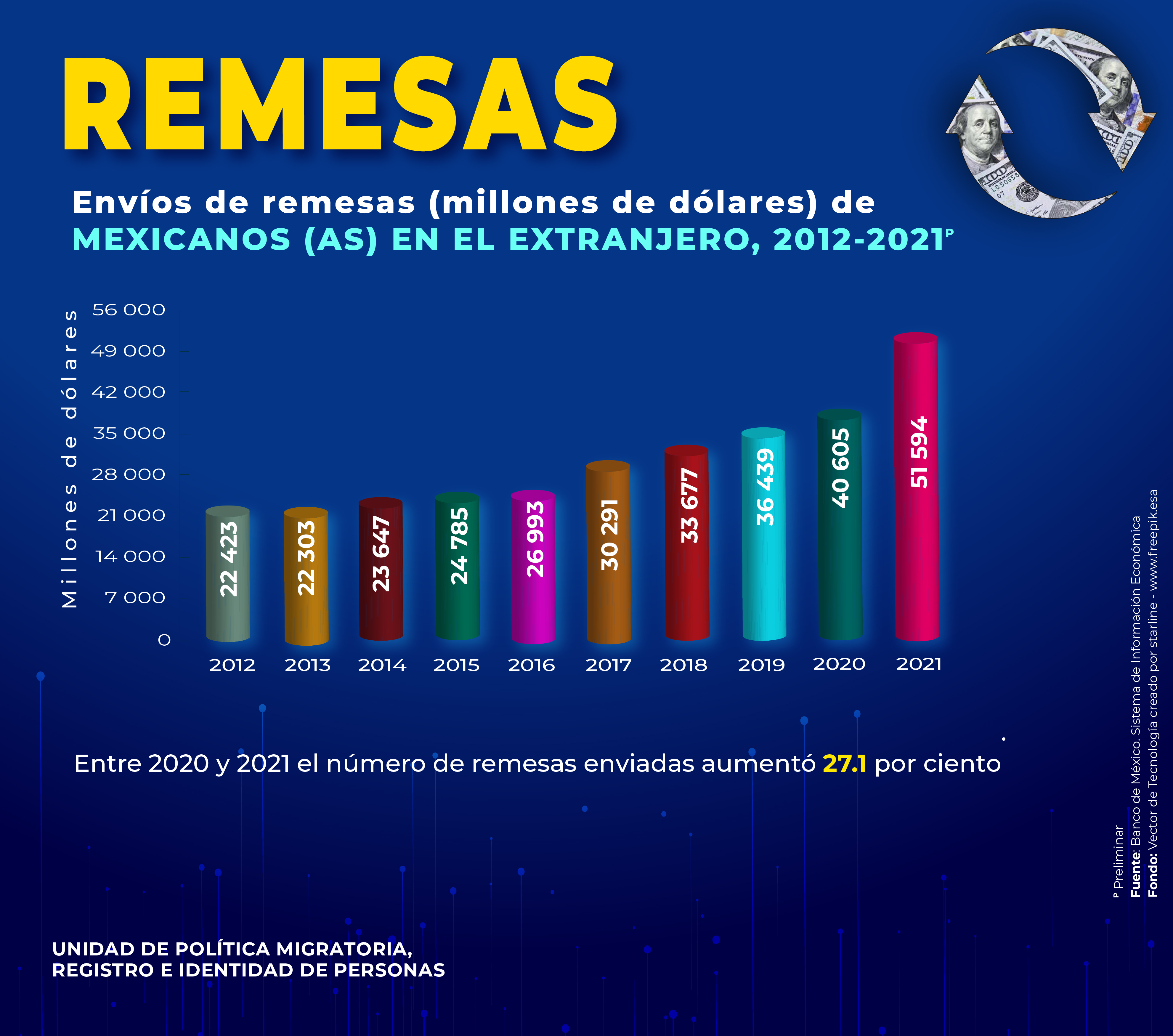 - Envíos de remesas (millones de dólares) de Mexicanos(as) en el extranjero, 2021
