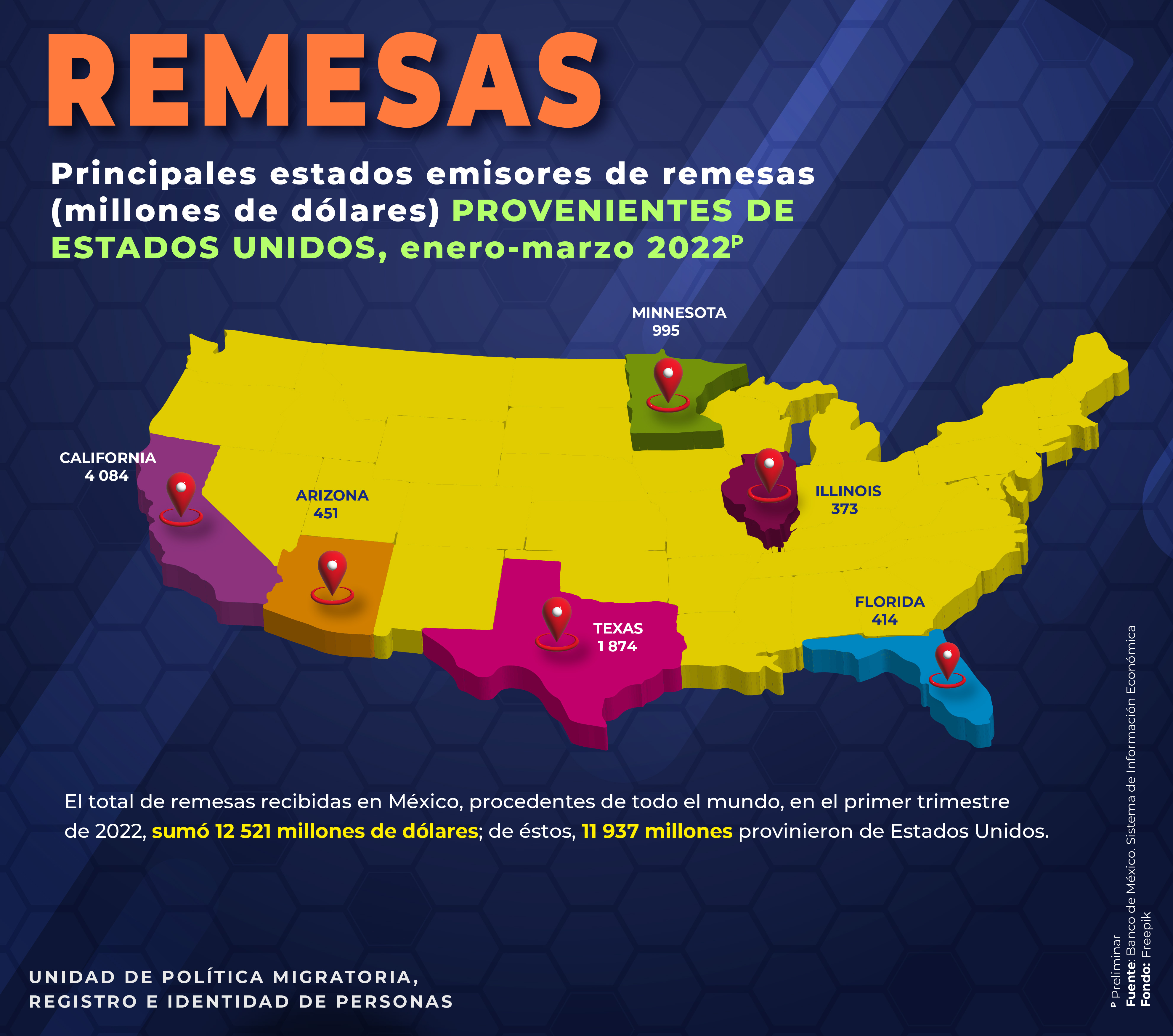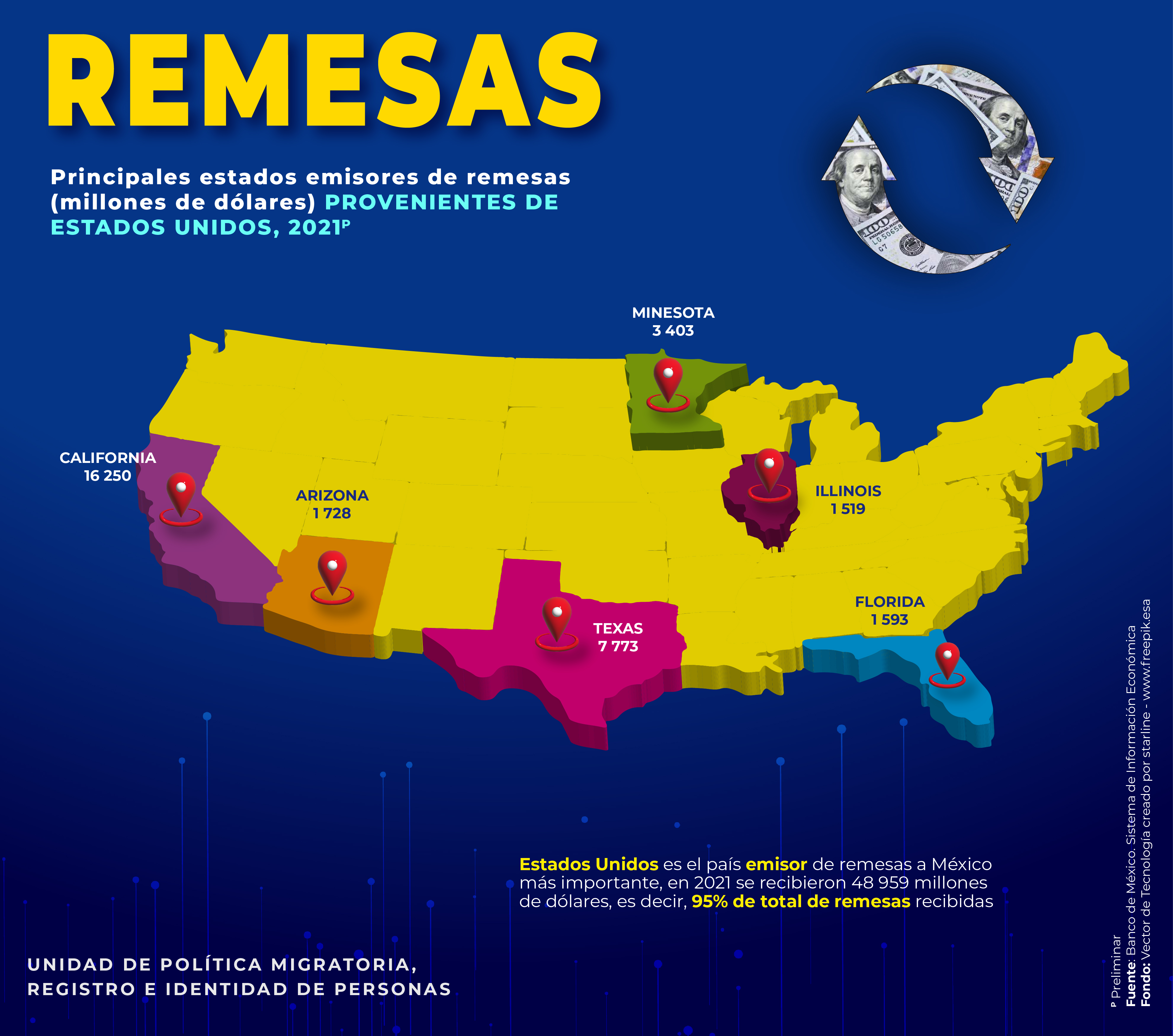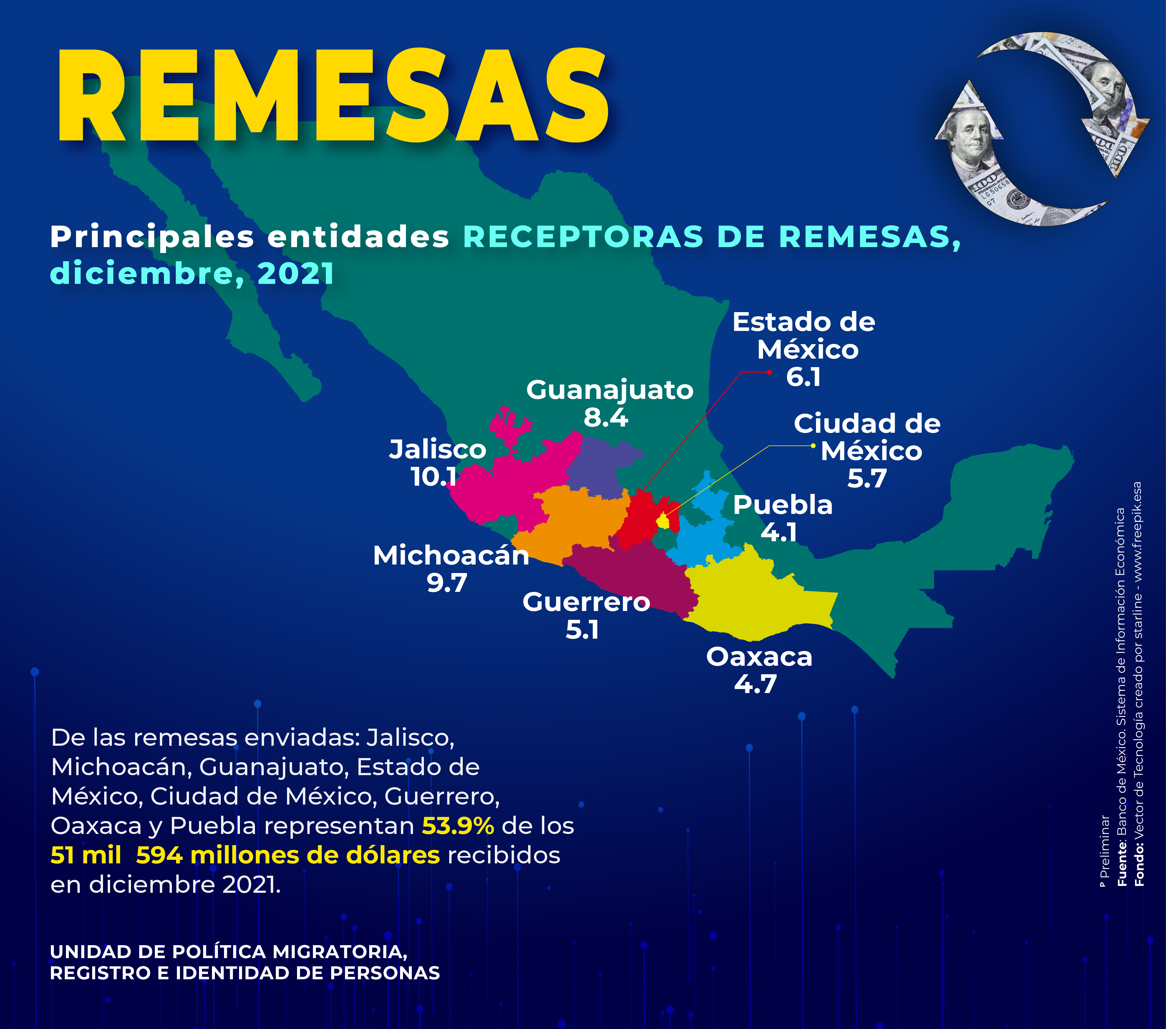 - Principales estados emisores de remesas (millones de dólares) provenientes de Estados Unidos, 2021
