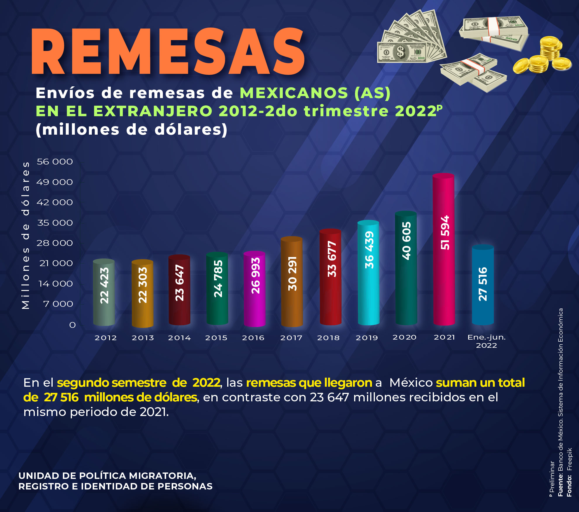 - Envíos de remesas (millones de dólares) de Mexicanos(as) en el extranjero, 2012-2do trimestre 2022