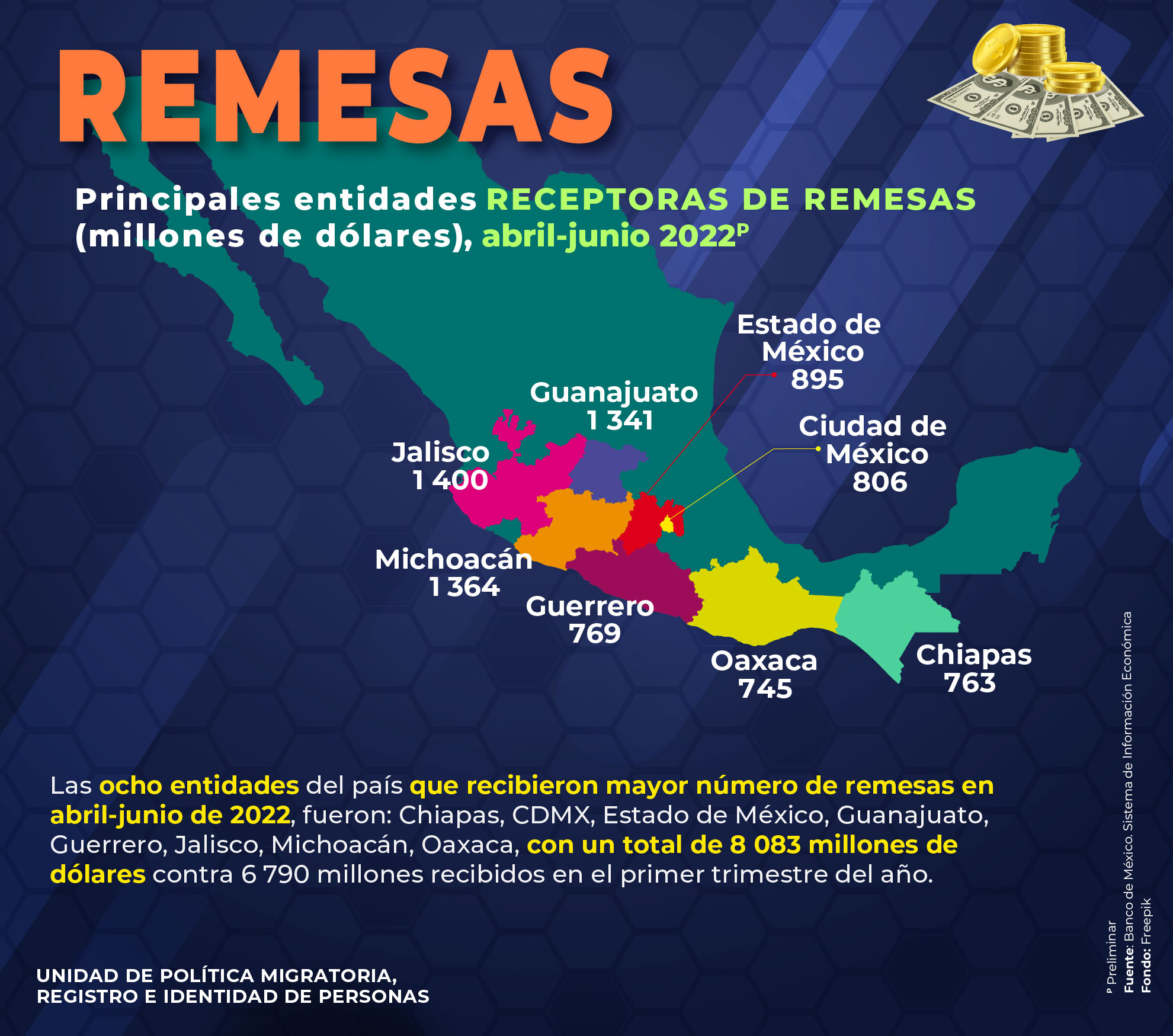 - Principales entidades receptoras de remesas (millones de dólares), abril-junio 2022